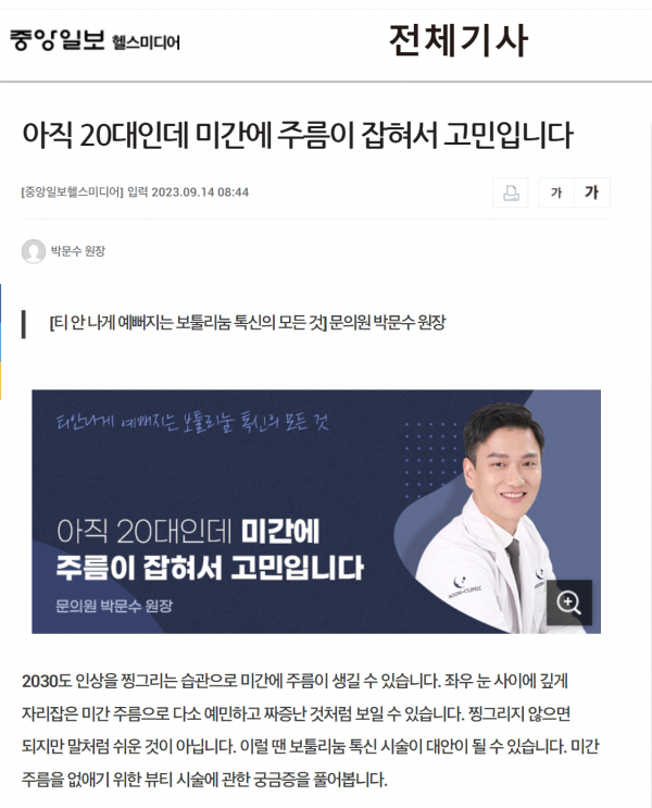 - 질의 :아직 20대인데 벌써 미간에 주름이 잡혀서 고민입니다. 평소 무언가에 집중하거나 잘 때 인상 쓰는 게 버릇이 돼 고치려고 하는데도 쉽지 않네요. 나중에 나이가 들어 지금보다 탄력이 더 떨어지면 어떻게 될지 걱정되고 스트레스가 많습니다. 미간 주름, 어떻게 해결하면 좋을까요?