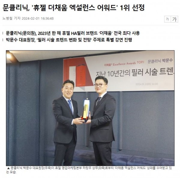 문클리닉(대표원장 박문수)은 글로벌 토탈 메디컬 에스테틱 전문기업 휴젤이 주최하는 ‘더채움 엑셀런스 어워드(THECHAEUM®Excellence Award)’에서 1위에 선정됐다고 1일 밝혔다.